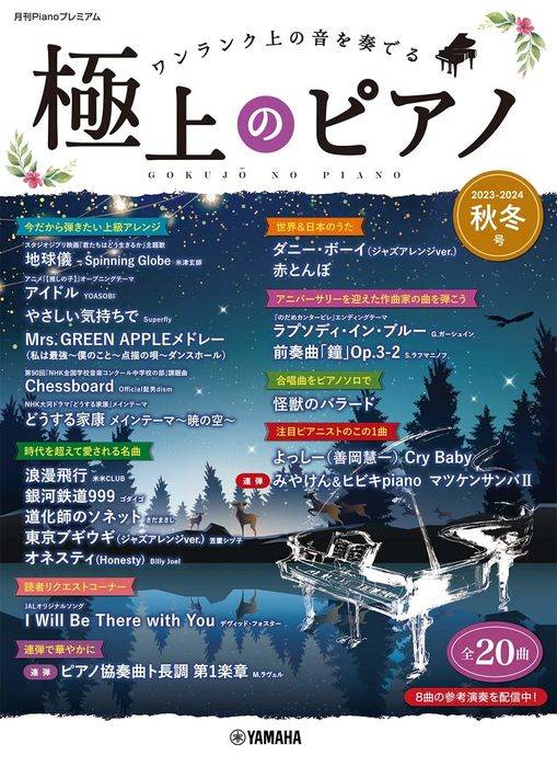 話題の曲をもっと自由に、華やかに!上質なアレンジでお届けします♪弾きごたえのある華やかなアレンジで、ヒット曲・懐かしの名曲・クラシック・合唱曲などバラエティー豊かに全20 曲を収載したピアノ上級者向けの曲集です。