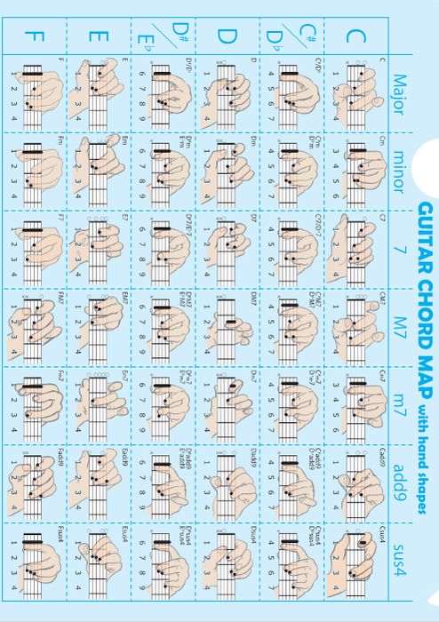 手と指板のイラストで押さえ方がわかりやすいギターコード表(ダイアグラム)をプリントしたA4クリアファイルです。