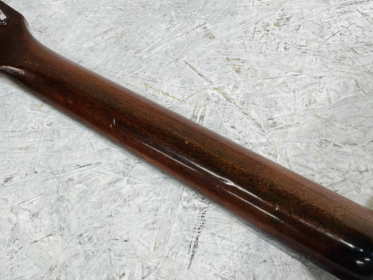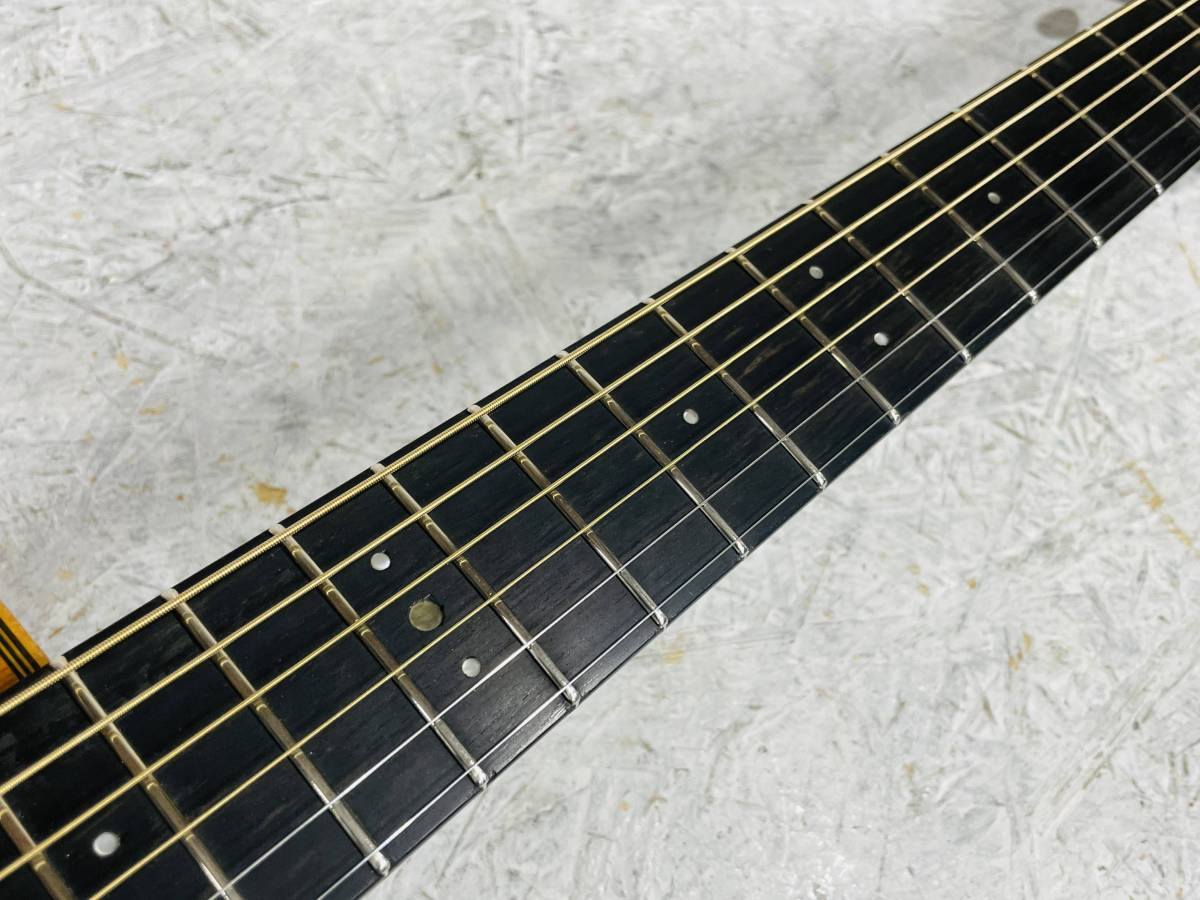状態 : 年代相応の傷、使用感があります。ペグはやや渋めですが問題なく使えます。ヘッド裏に割れ補修と思われる形跡があります。現状で強度は問題ありません。指板は調整により薄くなっています。ナット、フレット、サドル、ブリッジピン、エンドピンは交換されています。ブリッジも調整されていると思われます。弦高は6弦12F約3.2mm、1弦12F約1.8mmで弾きやすい状態。サドル下げ幅はまだ十分な余裕があります。フレットは残り8割程度。ネック反りはありません。トラスロッドは締めきってはいませんが余裕は僅かと思われます。トップの変形は年代を考えると殆ど無いといって良い程度です。使い込まれてはいるけど、丁寧に修理しながら弾きこんできた、という状態です。